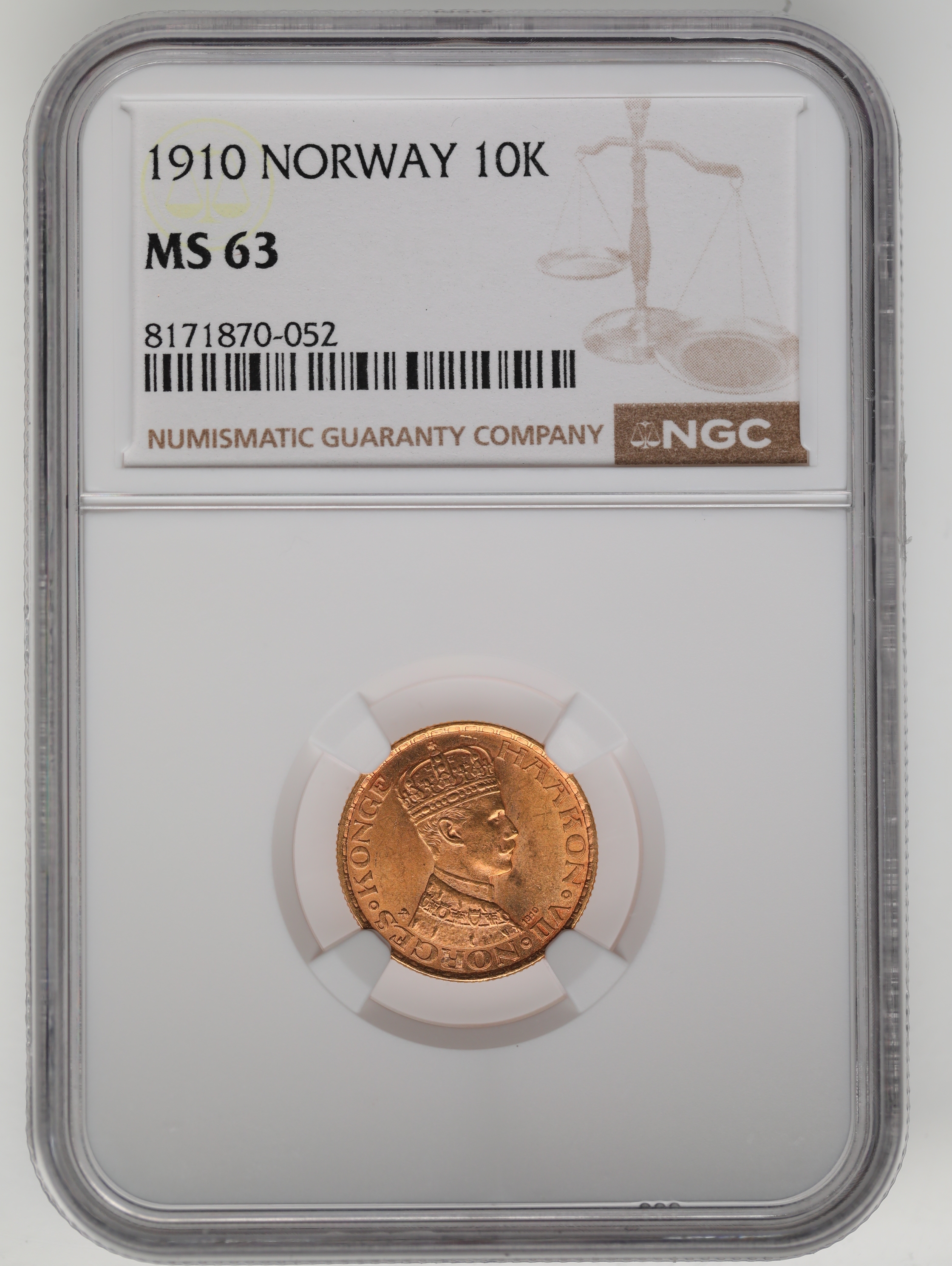 NORWAY. Haakon VII. 10 Kroner 1910. NGC MS63.