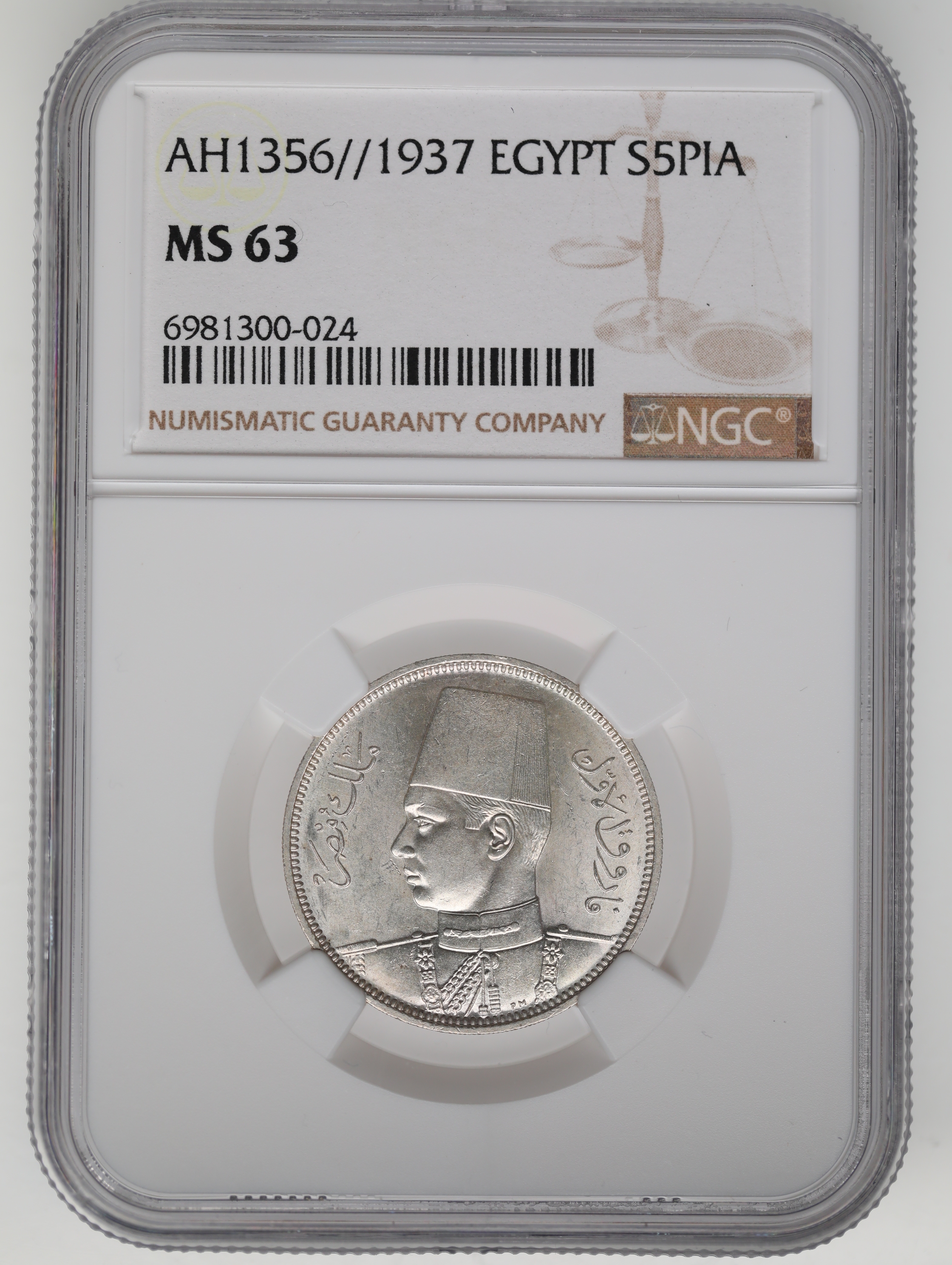 EGYPT. Farouk I. 5 Piastres. 1937. NGC MS63.
