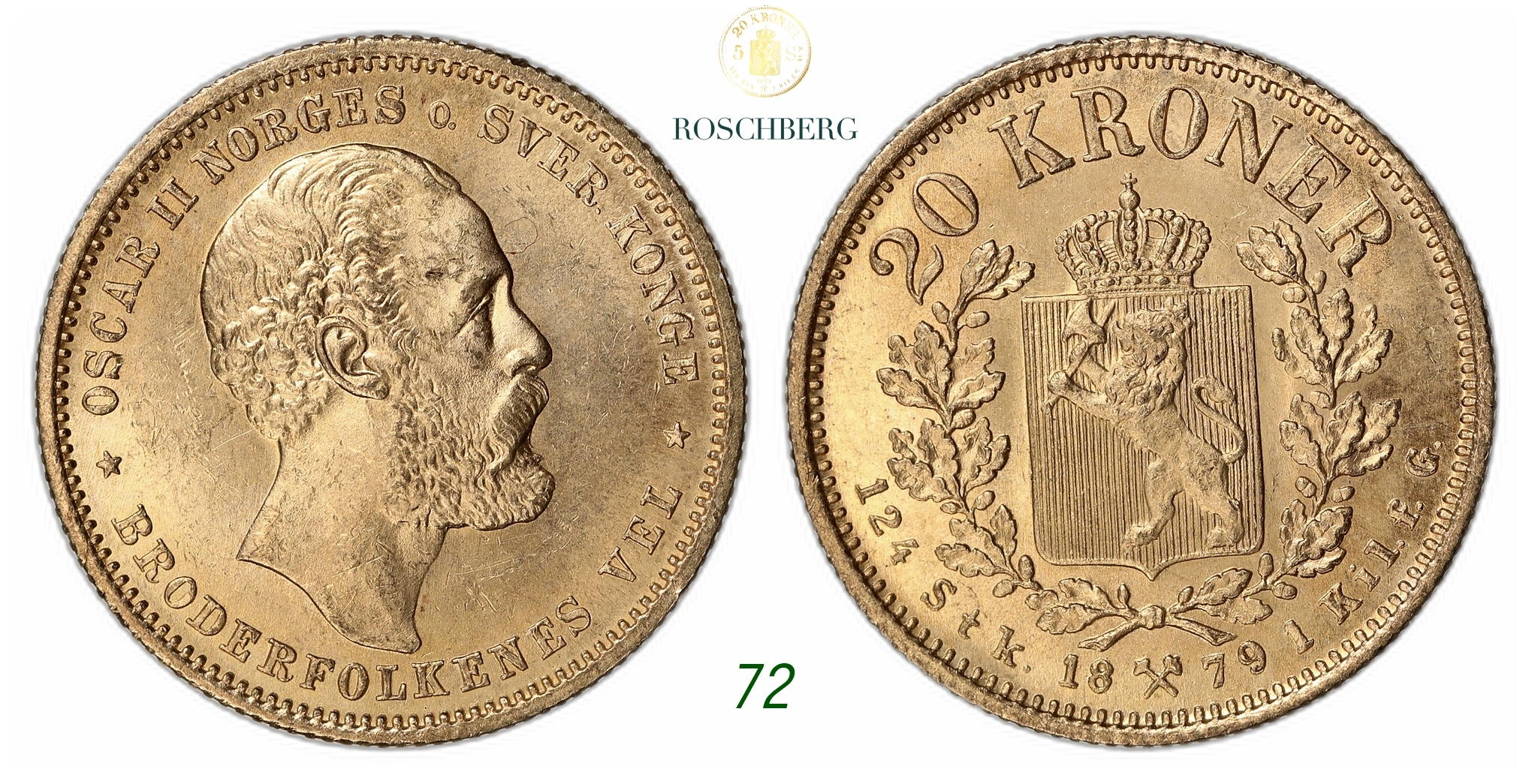 NORWAY. Oscar II. 20 Kroner Gold 1879.