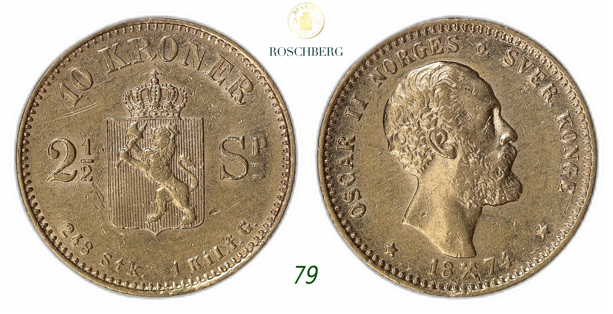 NORWAY. Oscar II. 10 Kroner / 2.5 Spd. Gold 1874.