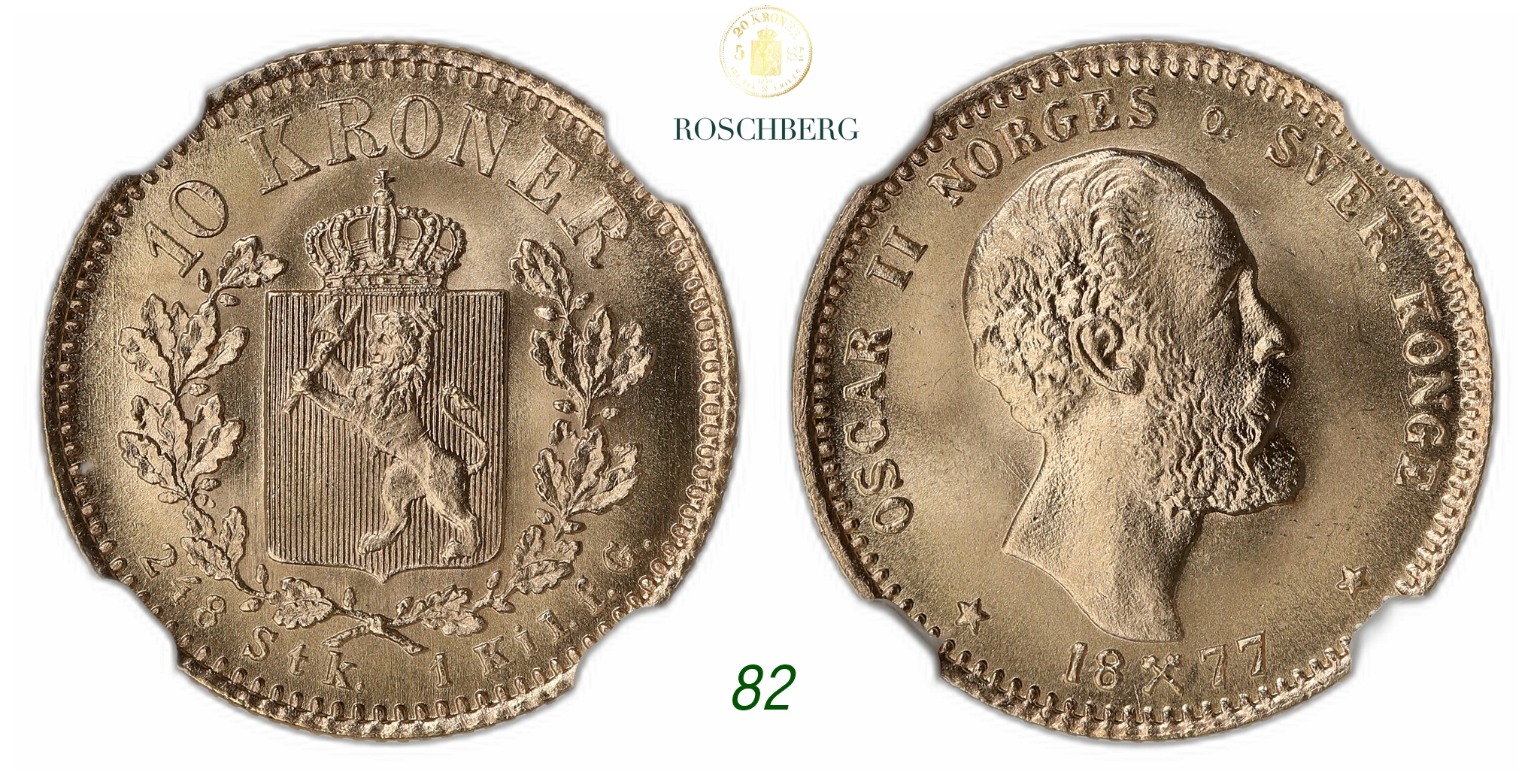 NORWAY. Oscar II. 10 Kroner Gold 1877.