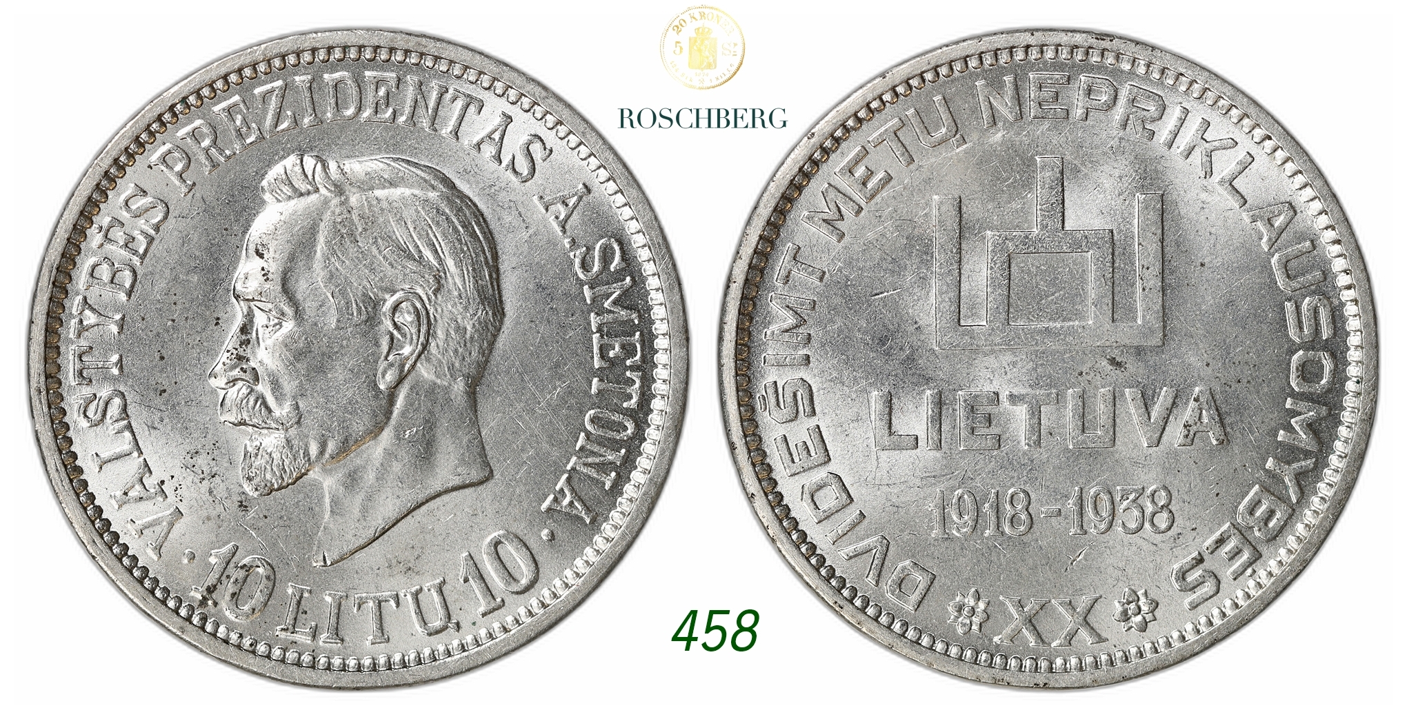 LITHUANIA. Republic. 10 Litu 1938.
